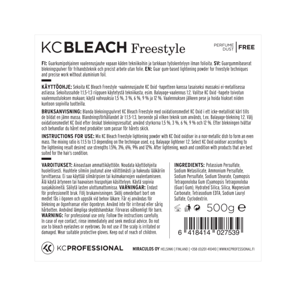 Lightening powder for freehand techniques Best for: When you want a product for creative freehand techniques and precise work. KC Bleach Freestyle is a guar gum based lightening powder that turns into creamy soft consistency when mixed with a developer and is easy to work into hair with a freehand technique. Will not liquify, swell or change its consistency during the processing time. You can alter the mixing ratio to create the perfect consistency for each technique and hair quality.